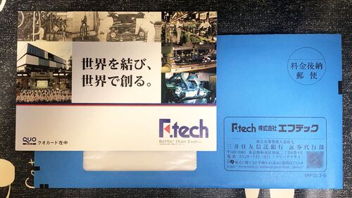 エフテック(7212)は、ホンダ系でホンダ向けが7割超の部品会社。 3月に権利確定があり、クオカードが戴けます。 優待到着時期 優待品のご紹介 保有状況について 株式情報 優待到着時期6月下旬 優待品のご紹介株主総会決議通知の封筒に同封で届きました。 使…